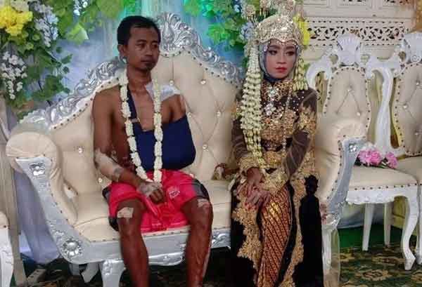 Được biết, đám cưới này là của một cặp đôi đến từ Indonesia vào ngày 2/4 vừa qua. Bức ảnh được chụp tại nhà cô dâu ở tỉnh Đông Java. Trong ảnh, có thể thấy toàn thân chủ rể đầy thương tích, mặc độc chiếc quần đùi đỏ, để trần nửa người trên, tay bó bột và đặc biệt nét mặt của anh buồn thiu đầy khó hiểu.