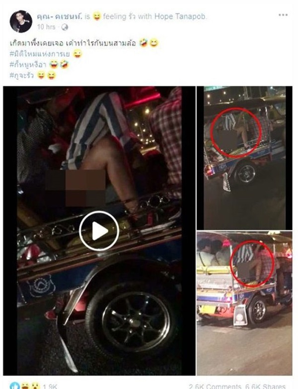 Truyền thông địa phương đưa tin, sự việc xảy ra hôm 13/12 vừa qua tại một địa điểm du lịch tại thành phố Bangkok, Thái Lan. Tại đây, xe tuk tuk là một loại xe phổ biến, được nhiều khách du lịch lựa chọn để di chuyển vì vừa rẻ vừa tiện. Tuy nhiên trên chính chiếc xe tuk tuk đó, một cặp nam nữ đã có hành vi nhạy cảm khó chấp nhận, trở thành đề tài bàn tán của cư dân mạng.