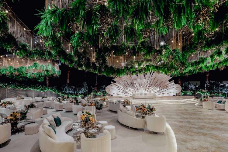 Một hệ thống cây xanh được lắp đặt ở trần nhà tạo nên không gian như một khu rừng thu nhỏ. Để đem lại cảm giác hiện đại cho đám cưới, người ta sử dụng tông màu trắng, điểm xuyết màu vàng cam của hoa hay giá đèn trang trí.