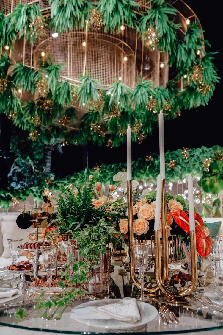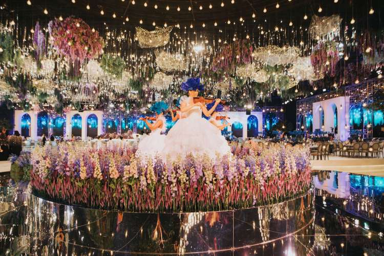 Họ đã biến sảnh tiệc thành một khu vườn cổ tích thực sự với rất nhiều hoa tươi, cây cỏ. Hoa được thả từ trên trần nhà xuống tạo cảm giác một khu rừng hoa đầy màu sắc.