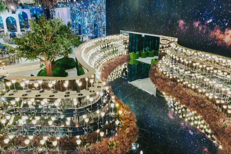 Ánh sáng, hoa, cây xanh, nến, đèm chùm và điểm nhấn trên trần nhà khiến các vị khách đến với hôn lễ đều phải trầm trồ khen ngợi. Nó thành công tạo nên không khí tráng lệ, hoành tráng như một vườn cổ tích khổng lồ choáng ngợp.