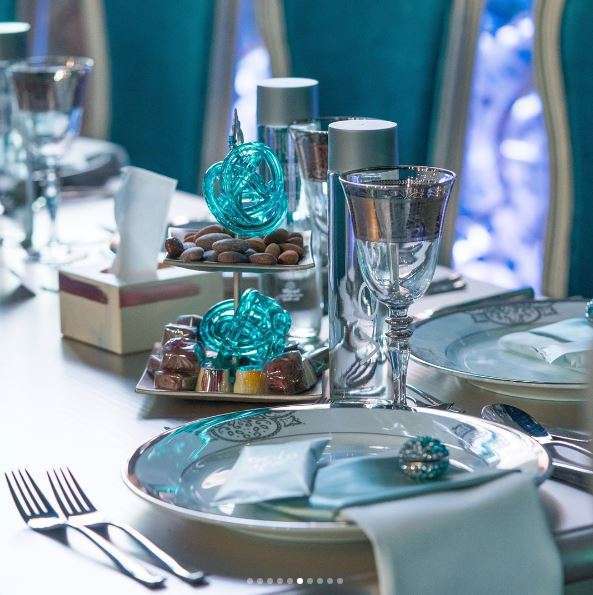 Chủ đề đám cưới được lấy cảm hứng từ đại dương sâu thẳm. Các màu xanh đậm, xanh hoàng gia, xanh ngọc lam và các sắc thái khác của xanh lam chiếm ưu thế trong bảng màu được sử dụng. Chủ đề về đại dương xuyên suốt tất cả các yếu tố của đám cưới cho đến những chi tiết nhỏ nhất như chiếc nút nhỏ trên áo gile của người phục vụ.