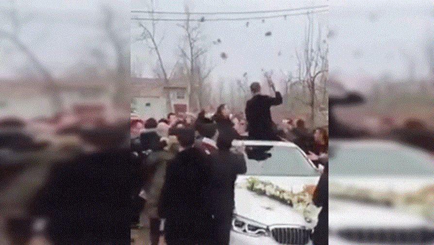 Trong khi đó, rất nhiều quan khách của đám cưới đang đứng vây quanh chiếc xe của chú rể. Khi thấy tiền được tung lên, mọi người thi nhau đưa tay với, rồi lại tranh nhau cúi xuống nhặt, gây nên một khung cảnh hỗn độn, không hề giống một đám cưới thông thường.