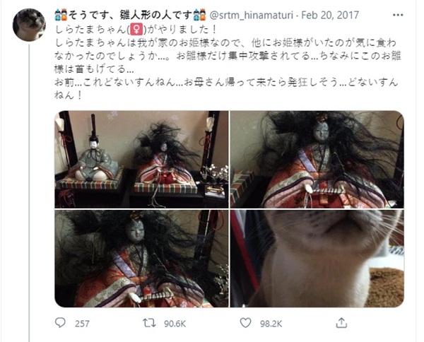 Theo đó, gia đình của @TiKuBi_girl đã tiến hành bày biện búp bê chuẩn bị cho ngày 3/3 sắp tới thì bị mèo cưng, Shiratama, quấy phá. Thế là con vật đã nhào vô tấn công một trong số những con búp bê. Lúc đầu, @TiKuBi_girl chỉ đơn giản cho rằng con mèo ghen tị với những con búp bê xinh đẹp nên đã bày trò phá phách một chút thì thôi, cô sắp xếp lại mọi thứ rồi yên tâm rời khỏi nhà.