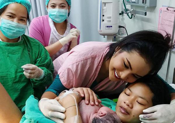 Ruamsin có mặt trong phòng sinh và tự cắt dây rốn cho con.
