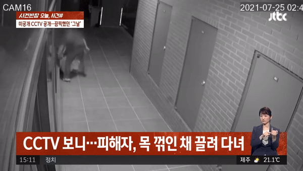 Thay vì báo cảnh sát, gã bạn trai bạo lực lại lôi Hwang đi vào thang máy, từ tầng 1 lên tầng 8, nơi hắn ở, rồi trở lại tầng trệt của tòa nhà. Trong quá trình bị kéo lê đi khắp nơi, Hwang bị gãy cổ và bị đặt nằm sấp khiến phần trán bị tổn thương. Vết máu của cô vương vãi ở khắp nơi bị hung thủ lôi qua. Tuy vậy, Lee vẫn tiếp tục kéo bạn gái đi mà không hề có hành động sơ cứu cho Hwang.