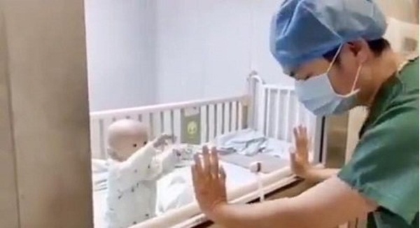 Bé 9 tháng bị nhiễm virus Corona nên phải nằm phòng cách ly. Nhìn thấy bố, cậu bé lập tức muốn được hưởng hơi ấm từ bố.