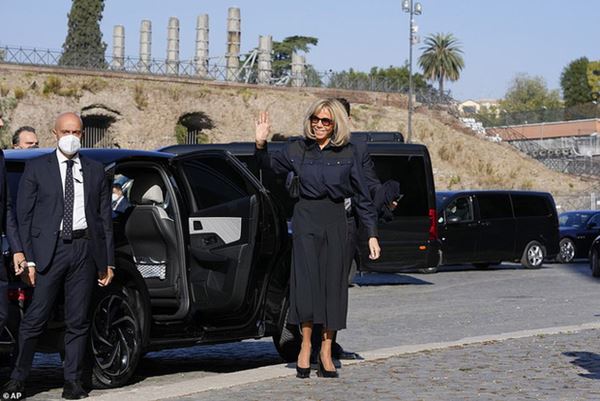 Một trong số Đệ nhất phu nhân nổi bật hơn cả là bà Brigitte Macron, vợ của Tổng thống Pháp. Xuất hiện tại buổi gặp mặt, người phụ nữ 68 tuổi này trông thanh lịch và trang nhã với áo sơ mi lụa và váy maxi tối màu. Đệ nhất phu nhân Pháp nở nụ cười rạng rỡ vẫy tay chào mọi người.