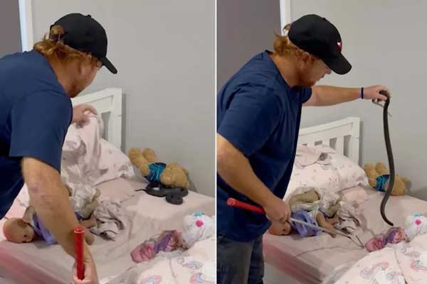 Đoạn video được đăng tải cho thấy chuyên gia bắt rắn Bryce Lockett đang tiến đến gần chiếc giường, nơi con rắn đen đang nằm lẫn giữa những con thú nhồi bông và búp bê. Anh nhẹ nhàng di chuyển những món đồ chơi sang một bên để quan sát rõ hơn, sau đó dùng móc để khéo léo đưa đuôi con rắn vào tay. Khi đã kiểm soát được con rắn, Lockett nhấc nó lên và nói: "Nó đây rồi." Lockett cũng lưu ý rằng con rắn sắp thay da. Đoạn video kết thúc bằng cảnh con rắn đang trườn vào túi đựng chuyên dụng.