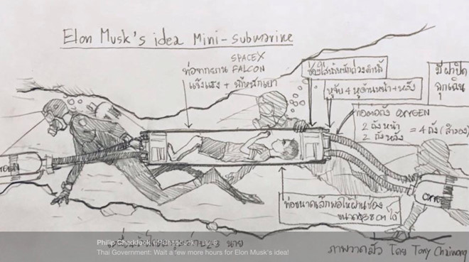 Hôm 10/7 tỷ phú người Mỹ đăng dòng tweet cho hay: "Tôi vừa trở về từ hang số 3. Tàu ngầm mini đã sẵn sàng khi cần thiết. Nó được làm từ một phần quả tên lửa và sẽ mang tên "lợn hoang" (Wild boar, hay "heo rừng"). Chúng tôi sẽ đặt nó lại đây trong trường hợp cần kíp trong tương lai. Thái Lan đẹp tuyệt vời".
