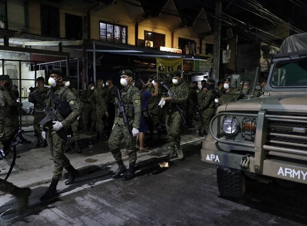 Cảnh sát và quân đội được triển khai đến Manila vào rạng sáng 15/3. Họ lập chốt kiểm soát mọi lối ra vào thủ đô. Tuần duyên Philippines tuyên bố lệnh cấm hoạt động ở Vịnh Manila, miễn trừ cho các tàu hàng, tàu cá, phương tiện chính phủ và một số tàu thuyền nước ngoài thuộc diện đặc biệt. Ảnh: AP.