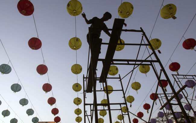 Một người đàn ông chuẩn bị lồng đèn tại chùa Maitreya, Sumatra, Indonesia.