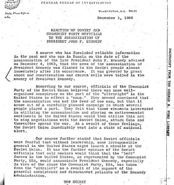 Mới đây nhất, tờ New York Post dẫn tài liệu được phát hành từ Cục lưu trữ quốc gia Mỹ liên quan đến vụ ám sát Tổng thống Mỹ John F. Kennedy cho thấy một số quan điểm của Liên Xô. Theo đó, chính quyền Liên Xô từng coi vụ ám sát cố Tổng thống Kennedy là do Phó Tổng thống Lyndon B. Johnson tổ chức.