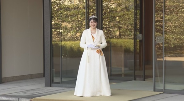 Nàng công chúa vừa tròn 20 tuổi bước ra trong trang phục truyền thống thanh lịch màu trắng có tên gọi là Robe Decorte, đầu đội vương miện kết hợp cùng vòng cổ tinh tế và đeo Huân chương. Trong đoạn video được chia sẻ trên truyền thông Nhật Bản có thể thấy, Aiko nhẹ nhàng bước ra ngoài, nở nụ cười rạng rỡ và cúi đầu chào báo giới.