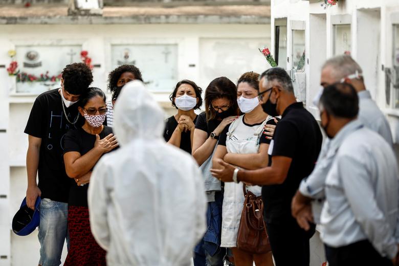Người thân cầu nguyện trong tang lễ của người tử vong vì Covid-19, Paulo Ferreira Campos, 57 tuổi, tại nghĩa trang Nossa Senhora Aparecida ở Manaus, bang Amazon, ngày 15/4/2021.