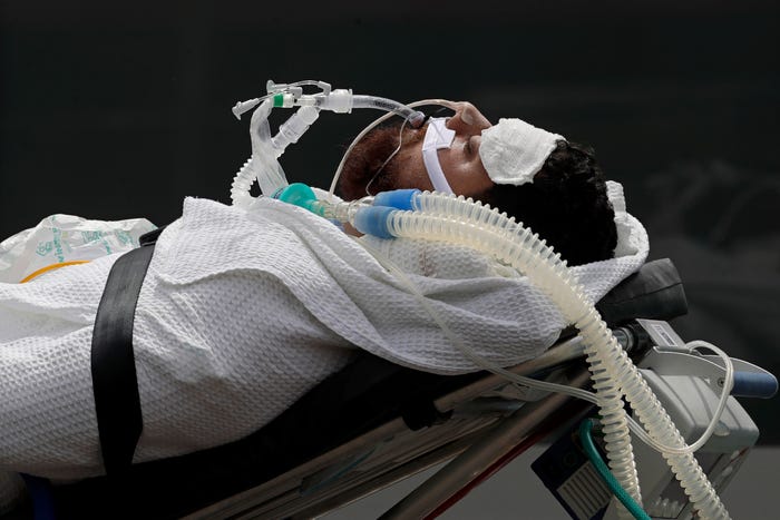 Các bệnh nhân có kết quả xét nghiệm dương tính với nCoV nằm chờ ở hành lang để được chuyển đến phòng chăm sóc đặc biệt ICU trong Phòng Cấp cứu Trung tâm ở Bauru, bang Sao Paulo.