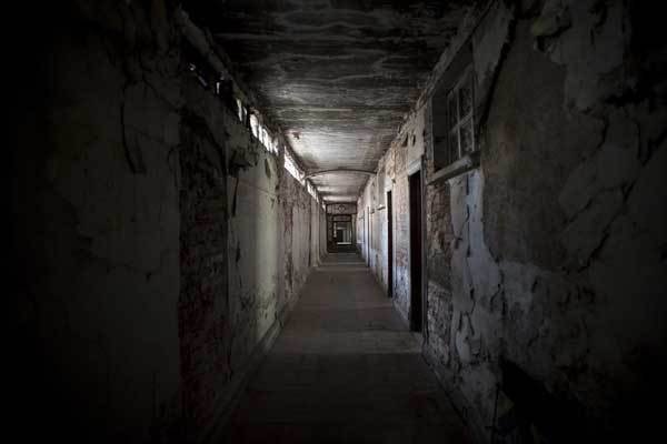 Hành lang tối om, sâu hun hút với những mảng tường đang bong tróc