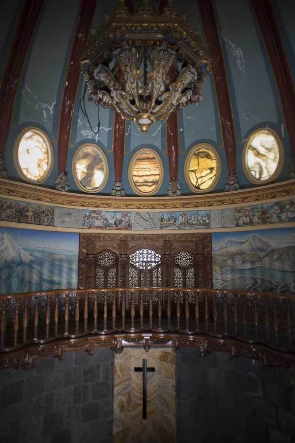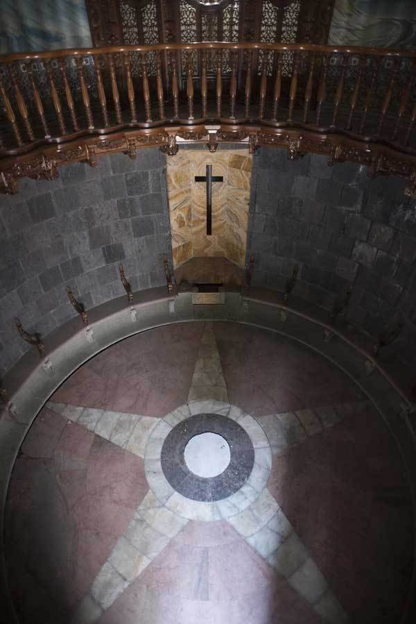 Dự án của ông Galván còn bao gồm ban công nhìn ra khu vườn rộng lớn và mái vòm được trang trí với những bức bích họa, cửa sổ hình bầu dục bằng đá cẩm thạch mờ,... Bên trong nhà thờ, ấn tượng choáng ngợp là hình một ngôi sao năm cánh bên trong vòng tròn lớn, cây thánh giá cũng như một loạt các biểu tượng và cụm từ miêu tả trên các bức tường.