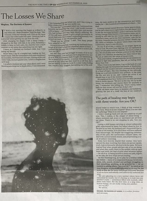 Vào ngày 25/11, Meghan Markle khiến truyền thông bàng hoàng khi bất ngờ chia sẻ về chuyện đã bị sảy thai đứa con thứ hai với Harry trong bài viết cá nhân của mình trên số báo mới của tờ New York Times. Trong đó, sự việc đau lòng xảy ra khi thai nhi trong bụng mới được 2 tháng đã để lại nỗi đau "khó chữa lành" cho vợ chồng họ cùng gia đình.