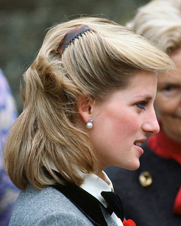 Góc nghiêng đẹp đến nao lòng của Công nương Diana khi để mái tóc dài lỡ vai, buộc nửa đầu và nhấn nhá phụ kiện đầy tinh tế.