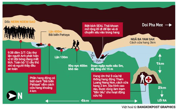3 vị trí các thành viên đội bóng cần lặn qua khi di chuyển ra cửa hang, cách dốc Nern Noem Sao gần 4km. Đồ họa: Bangkok Post.