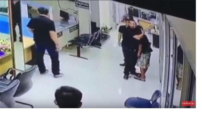 Đoạn clip ghi lại cảnh tượng người đàn ông cầm dao đứng bên trong đồn cảnh sát Huai Khwang, Bangkok, Thái Lan khiến nhiều người có mặt tại đó không khỏi sợ hãi.
