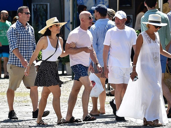 Trong khi đó, tỷ phú Bezos mặc áo phông màu hồng và quần short màu xanh in họa tiết. Ông cười đùa vui vẻ với những người bạn của mình khi người tình đi bên cạnh. Trong khi đó, người tình của tỷ phú Amazon giữa chặt tay ông Bezos không rời, cả hai gắn với nhau như hình với bóng.