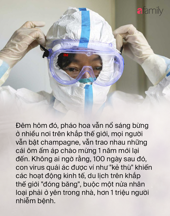 Đêm hôm đó, pháo hoa vẫn nổ sáng bừng ở nhiều nơi trên khắp thế giới, mọi người vẫn bật champagne, vẫn trao nhau những cái ôm ấm áp chào mừng 1 năm mới lại đến. Không ai ngờ rằng, 100 ngày sau đó, con virus quái ác được ví như "kẻ thù vô hình" khiến các hoạt động kinh tế, du lịch trên khắp thế giới "đóng băng", buộc một nửa nhân loại phải ở yên trong nhà, hơn 1 triệu người nhiễm bệnh, trong đó có cả Thủ tướng Anh, Thái tử Anh, Phó tổng thống Iran cùng hàng loạt người nổi tiếng khác. Hơn 75.000 người đã ra đi mãi mãi.