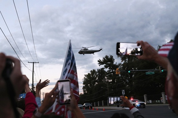 Ông mặc suit, đeo khẩu trang và tự đi. Tổng thống Mỹ vẫy chào các phóng viên và nói “cảm ơn rất nhiều”, ra hiệu bằng ngón tay cái trước khi lên xe để ra trực thăng Marine One.