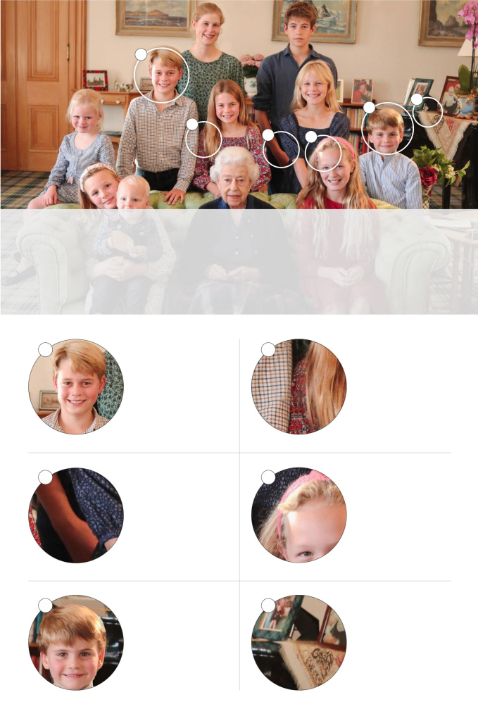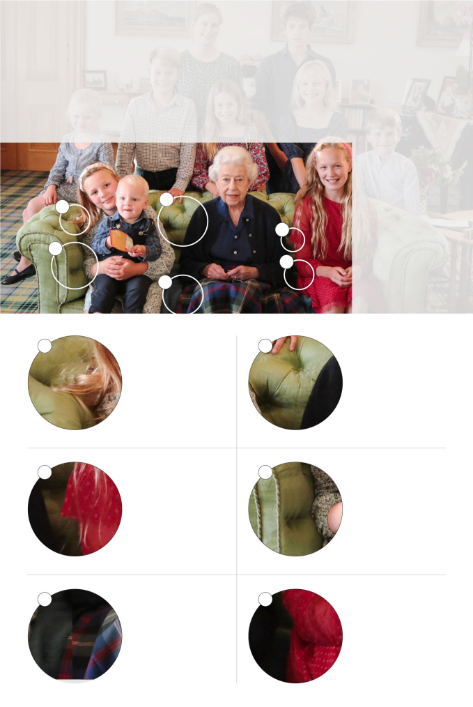 Những điểm mâu thuẫn trong bức ảnh bao gồm sự sai lệch trên váy và chiếc chăn mỏng đắp trên chân của cố Nữ vương Elizabeth II cũng như chiếc ghế sofa mà bà đang ngồi. Những sợi tóc của Công chúa Charlotte dường như đã được nhân lên, trong khi mép vai của Louis bị mờ và dường như chồng lên nền. Ánh sáng trên khuôn mặt của một số thành viên hoàng gia nhỏ tuổi trong ảnh cũng không phù hợp với ánh sáng tổng thể của bức ảnh.