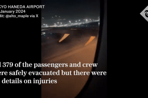 Máy bay Japan Airlines bốc cháy dữ dội trên đường băng ở Tokyo Máy bay của Japan Airlines bốc cháy ở sân bay Haneda, Tokyo. Giới chức Nhật Bản nói máy bay có thể đã va chạm với một máy bay tuần duyên. 379 hành khách và phi hành đoàn đã sơ tán.
