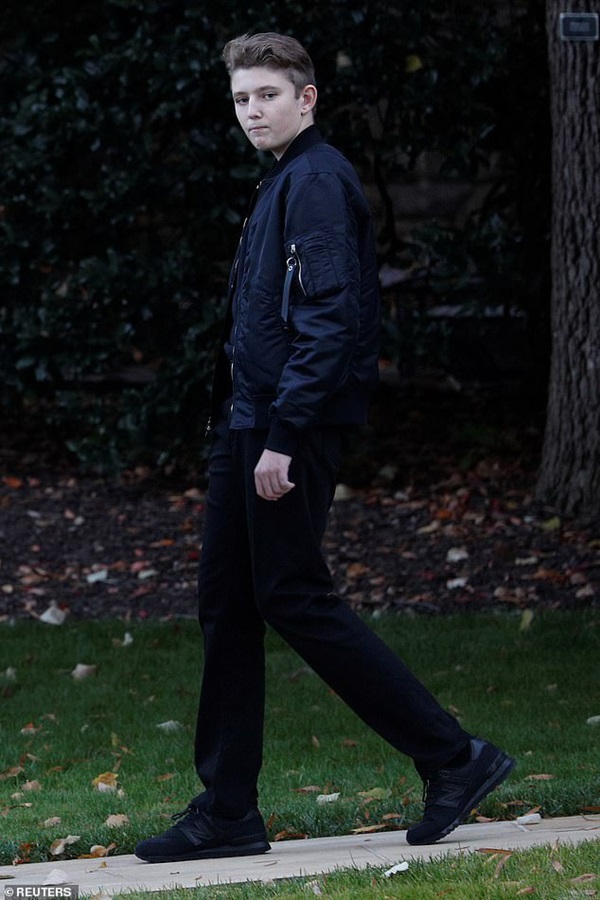 Barron Trump mặc áo phông đen kết hợp với áo khoác bomber đồng màu cùng giày thể thao New Balance. Mái tóc nâu cắt ngắn và được chuốt gel gọn gàng khiến Barron Trump trở nên nổi bật với vẻ đẹp như tạc tượng. Con trai út của Tổng thống Mỹ lặng lẽ đi theo sau bố mẹ và vẫy tay thân thiện chào mọi người.