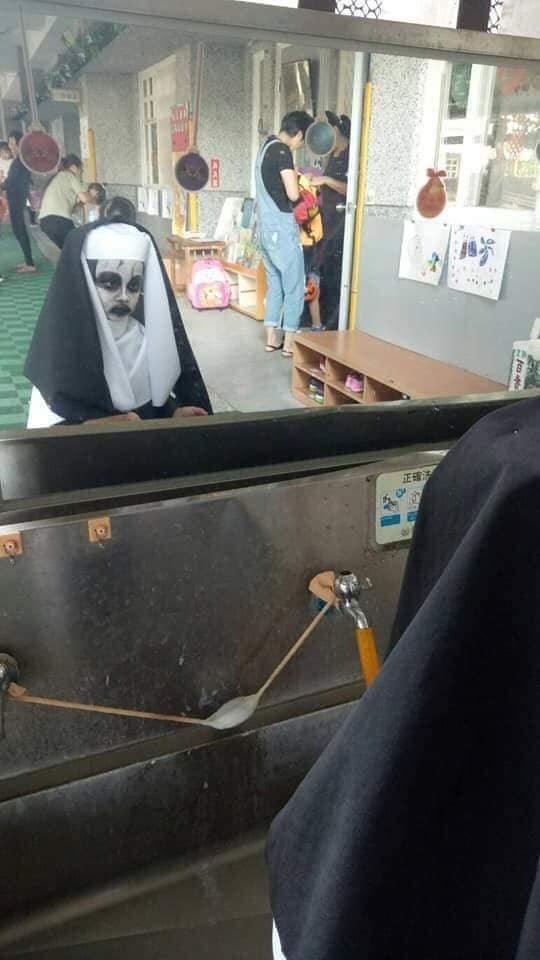 Theo dõi những bức ảnh trước khi hóa trang, "Tiểu ma sơ" là một cô nhóc đáng yêu và xinh đẹp, khác một trời một vực so với bộ dạng dọa ma lạnh lùng, đáng sợ. Cô bé đã rất hào hứng khi được mẹ đồng ý và giúp mình hóa trang theo nhân vật yêu thích, thậm chí còn không nỡ tẩy trang sau khi kết thúc hoạt động ở trường.