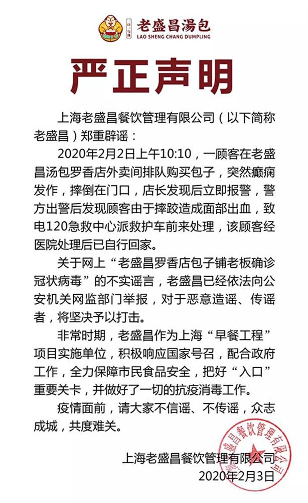 “Vào 10 giờ sáng ngày 2/2, có một người đàn ông đang đứng xếp hàng trước nhà hàng Lao Sheng Chang để mua bánh bao. Trong phút chốc, đột nhiên người này ngã nhào xuống đất. Sau khi người bán hàng phát hiện ngay lập tức đã báo cho cảnh sát và đội cấp cứu 120. Được biết, nguyên nhân khiến người này ngất là do đấu vật nên bị chảy máu. Sau khi được cấp cứu, người này đã hồi phục và có thể về nhà. Đối với việc cư dân mạng tung tin cho rằng có người nhiễm virus corona ngã trước nhà hàng là sai sự thật. Phía nhà hàng sẽ nhờ pháp lý can thiệp những tin đồn sai lệch”.