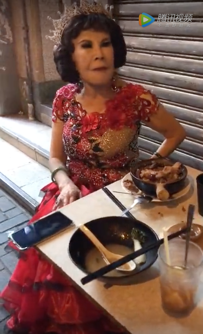 Tuy ngồi ở hàng quán đơn sơ nhưng Hoàng Hạ Huệ mặc váy dạ hội lòe loẹt và đội vương miện khiến nhiều người qua đường chú ý.