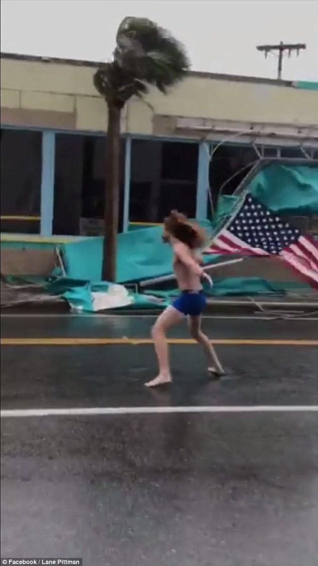 Trong cơn bão gió giật mạnh tới 137 km/h, Lane Pittman vẫn hiên ngang đứng giữa phố vẫy cờ Mỹ khi đang mặc đúng chiếc quần lót xanh của mình. Gió thổi càng mạnh, nhiều lúc suýt thổi bay thân hình mảnh dẻ của Lane, thì anh chàng này lại càng tỏ ra "sắt đá" hơn, thậm chí có lẽ còn thấy thích thú nữa chứ.