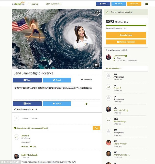 "Nếu bạn trả tiền xăng và tiền cà phê cho tôi, tôi sẽ đích thân tới South Carolina để dạy cho cơn bão Florence một bài học! Nước Mỹ muôn năm!" - Chàng Pittman viết trên trang gây quỹ của mình.