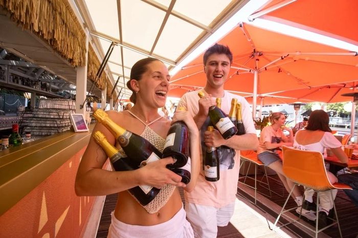 Bel O’Brien và Angus Fenton, hai nhân viên tại một quán bar ở Melbourne (Australia), chuẩn bị rượu champagne cho buổi tiệc mừng năm mới. Ảnh: Sydney Morning Herald.