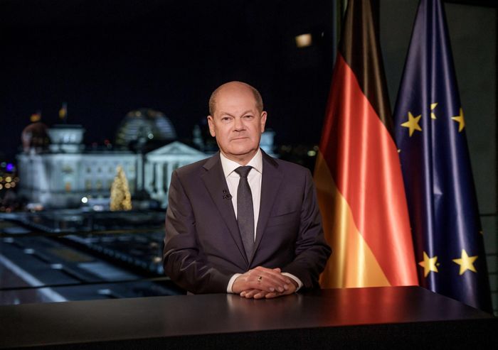 Thủ tướng Đức Olaf Scholz đọc thông điệp năm mới từ thủ đô Berlin. Ảnh: Reuters.