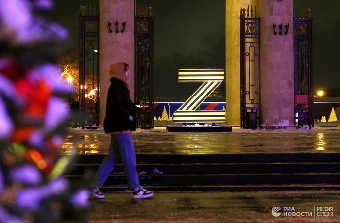 Khung cảnh trang trí năm mới bên ngoài công viên Gorky, Moscow. Nga. Một chữ cái “Z” lớn - biểu tượng cho “chiến dịch quân sự đặc biệt” của Nga tại Ukraine - cũng đã được dựng lên. Ảnh: RIA Novosti.