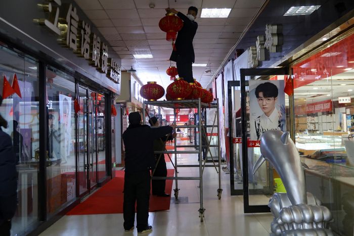 Các nhân viên treo đèn lồng chào đón năm mới ở một cửa hàng kính tại Vũ Hán, Trung Quốc. Ảnh: Reuters.