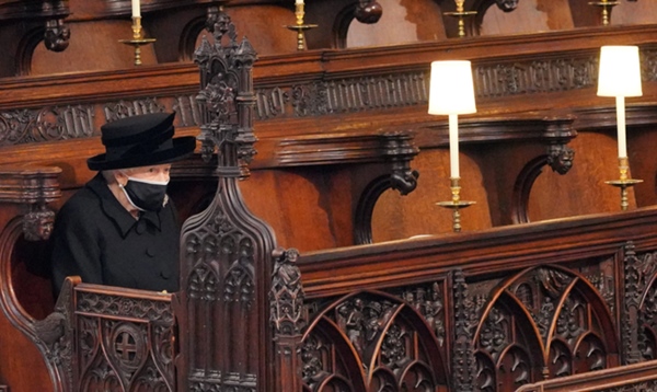 Nữ hoàng Elizabeth II mang khẩu trang, ngồi một mình và giữ khoảng cách với người tham dự. Bà được trông thấy lau nước mắt khi lễ truy điệu của chồng diễn ra. Hình ảnh Nữ hoàng cô độc ngồi một góc nhìn người bạn đời ra đi mãi mãi khiến dư luận xót xa.