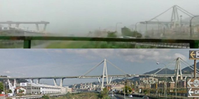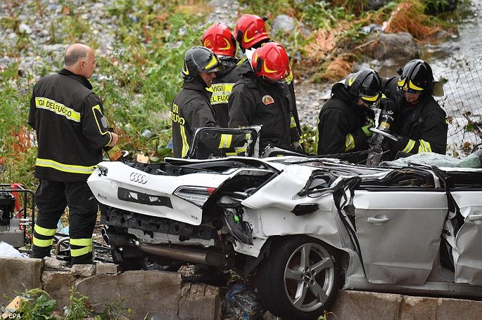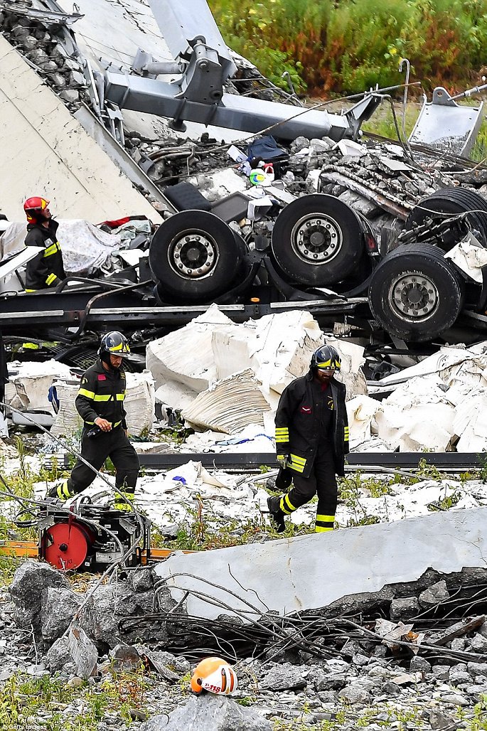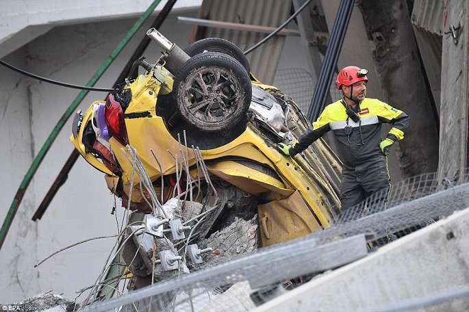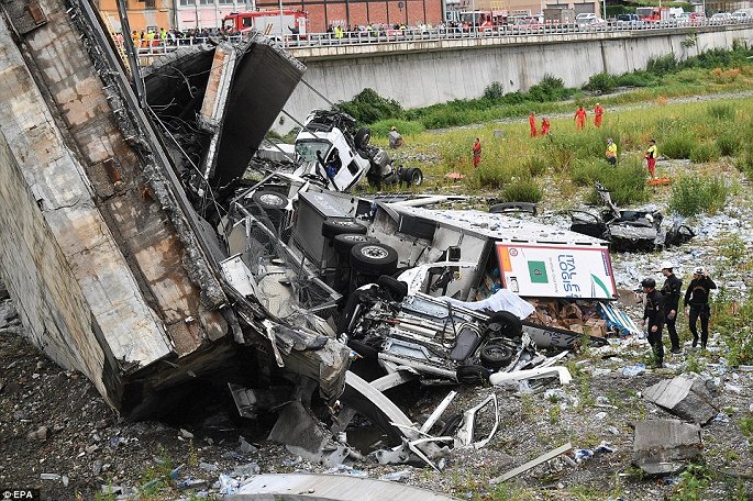 Nhiều ô tô bị chôn vùi trong đống đổ nát, 35 người thiệt mạng sau khi cây cầu Morandi thuộc tuyến cao tốc A10 ở thành phố Genoa, Italy, đổ sập vào khoảng 11h30 ngày14/8.