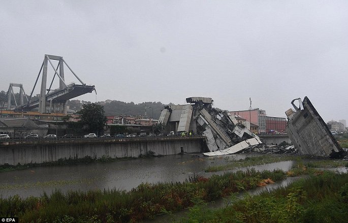 Cầu Morandi, dài hơn 1 km được xây dựng vào năm 1968, đặt trên theo người thiết kế nó là kiến trúc sư Riccardo Morandi, kết nối đường cao tốc A10 và A7 ở Italia. (Ảnh: Daily Mail)
