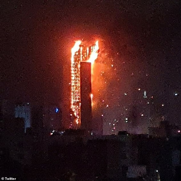 Những video quay từ hiện trường cho thấy ngọn lửa bốc cao lên đến đỉnh tòa nhà khi những tấm bê tông lớn rơi xuống đường bên dưới và khói bốc lên ngùn ngụt giữa đêm.