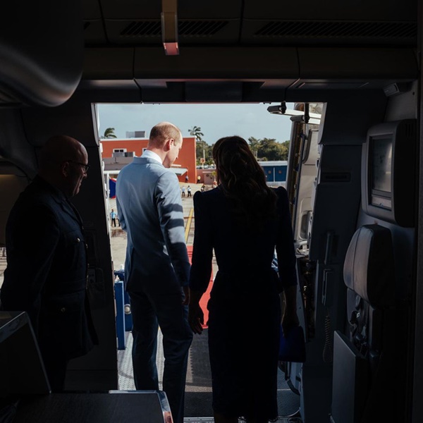 Trên tài khoản Instagram, vợ chồng Hoàng tử William đã vừa mới chia sẻ một bức hình hiếm hoi chưa từng thấy từ bên trong chiếc máy bay hoàng gia của họ. Bức ảnh cho thấy bóng lưng phía sau của cặp đôi đang bắt đầu bước xuống máy bay. Bên trong khoang có một nhân viên phụ trách đứng gần đó.