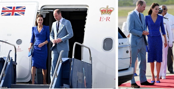 Công nương Kate xuất hiện nổi bật trong một bộ trang phục màu xanh thanh lịch của nhà thiết kế Jenny Packham. Trong khi đó, William chọn một bộ suit màu nhạt. Cặp đôi được trải thảm đỏ chào đón với nghi thức trang trọng bằng 21 tiếng súng và ba khẩu đại bác cỡ nhỏ.