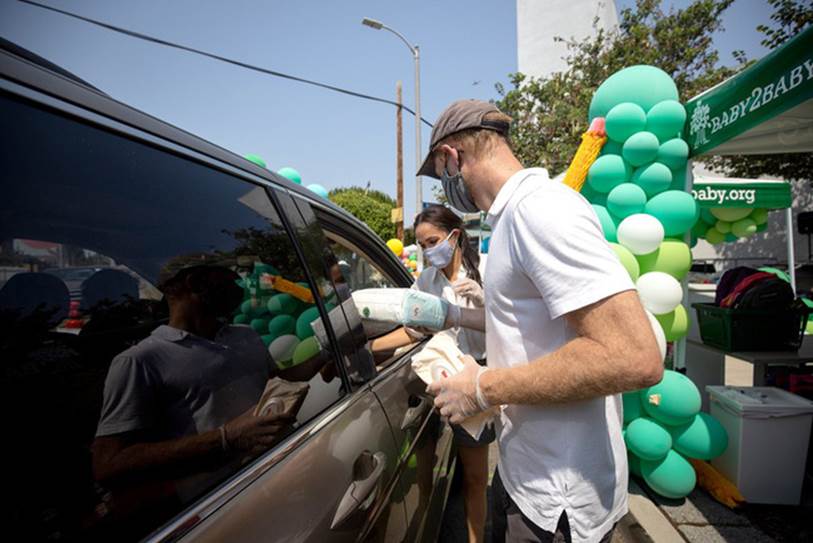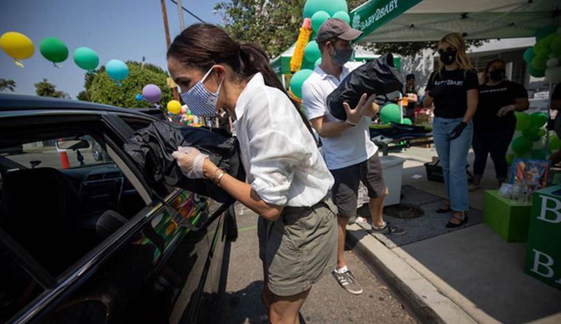 Vào ngày 21/8, tổ chức từ thiện Baby2Baby, nơi chuyên hỗ trợ tã lót, quần áo và các nhu yếu phẩm khác cho trẻ em ở những gia đình khó khăn đã chia sẻ hình ảnh của vợ chồng nhà Sussex đi làm từ thiện.