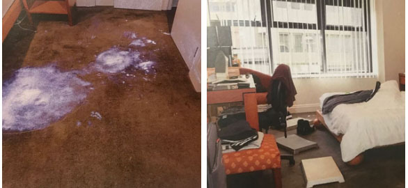 Tại đây, cặp đôi trẻ đã quan hệ tình dục với nhau trong rồi lúc hưng phấn người đàn ông đã bóp cổ Grace đến chết. Sau đó, hắn ra ngoài mua dụng cụ tẩy rửa cùng 2 chiếc vali để giấu thi thể nạn nhân vào 1 trong số đó. Camera an ninh tiếp đến bắt gặp hung thủ rời khỏi khách sạn cùng chiếc vali trước khi cảnh sát tìm thấy thi thể nạn nhân trong khu rừng ngoại ô.