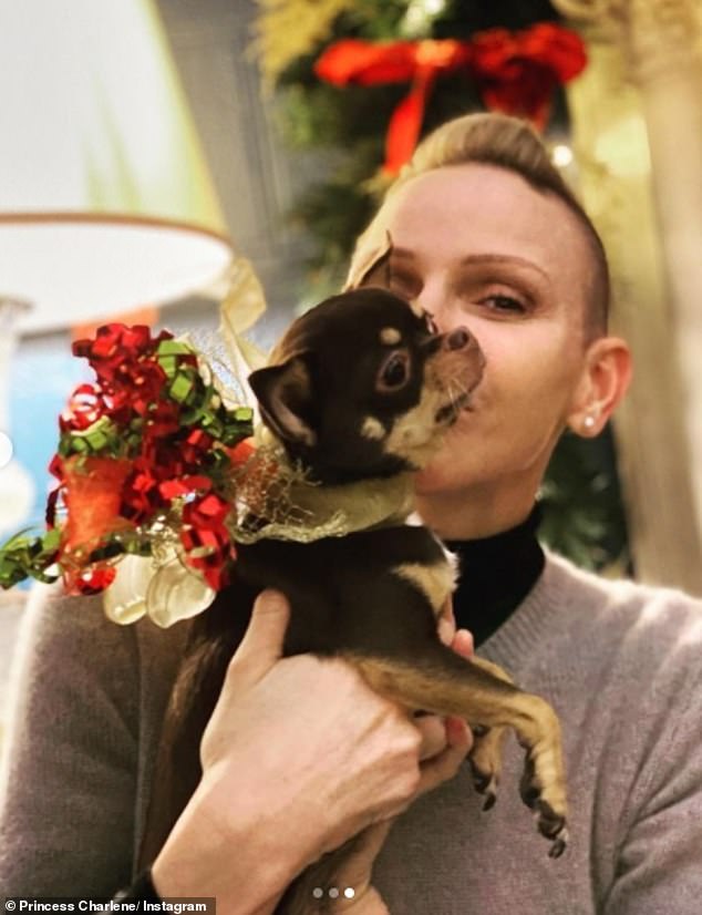 Tấm hình thứ 3 chụp Vương phi Monaco trong mái tóc cạo nửa đầu đang hôn con chó cưng của gia đình. Dường như Vương phi xinh đẹp nhất Monaco đã đón một lễ Giáng sinh vui vẻ và đầm ấm bên gia đình bất chấp những thông tin tiêu cực xuất hiện gần đây về cuộc hôn nhân của bà.